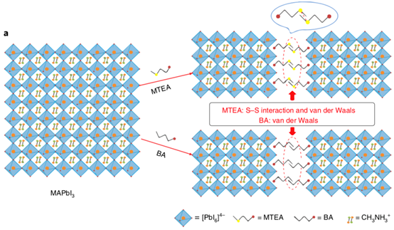 1. A new type of heteroatomic organic amine molecule 2-(methylthio)ethylamine (MTEA) is used to construct layered perovskites, through the S-S interaction between MTEA molecules in perovskite interlayer regions. The layered perovskite framework is further stabilized. Perovskite films with significantly improved stability are synthesized, and the interlayer charge transfer is effectively enhanced.