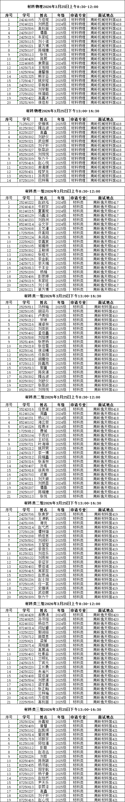 面试要求:请相关同学按照下图内分组时间顺序自行合理安排行程,提前到达指定地点外等候;每个学生面试时间8-10分钟,包含3分钟自我介绍以及相关提问环节。