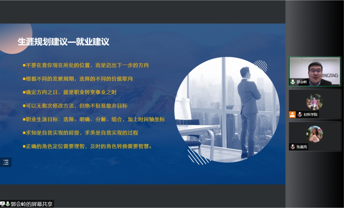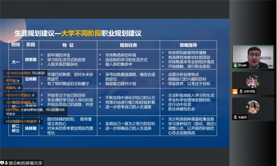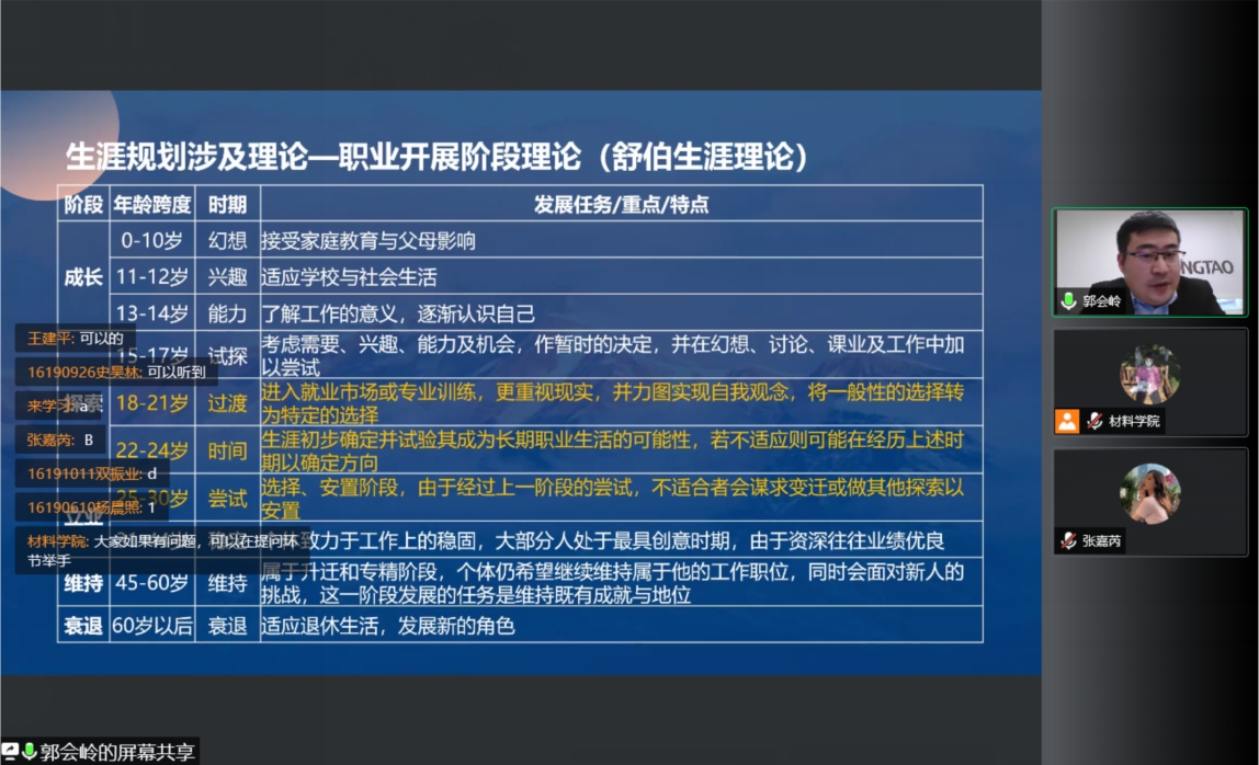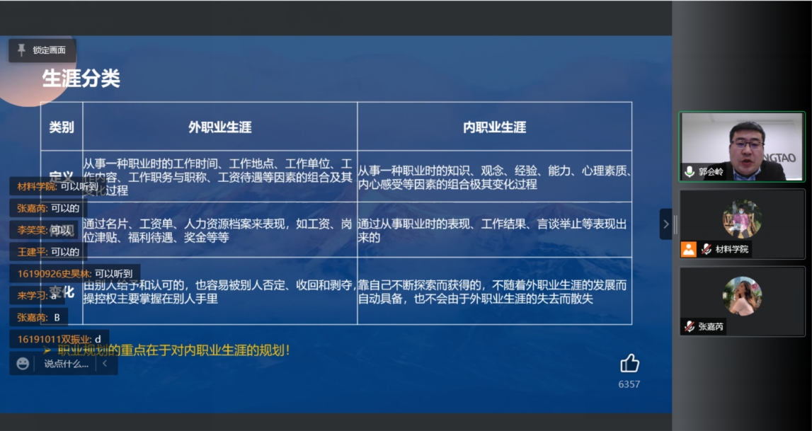 本次会议邀请到郭会岭老师,郭老师是一位优秀的人才测评师、二级心理咨询师、二级人力资源管理师,具有10年人力资源从业经验。会议伊始,郭老师向同学们提出自己是否有清晰的长远目标并强调生涯规划的重要性。会议中,郭老师首先向大家介绍了职业生涯的定义并讲解了生涯分为内、外职业生涯,并强调内职业生涯才是生涯规划过程中的重中之重;然后向大家具体讲述了生涯规划理论和工具,通过三种不同的理论从多个方面介绍了生涯的各个阶段;最后向大家讲解了现阶段对于人生职业生涯规划时的经验和就业建议。