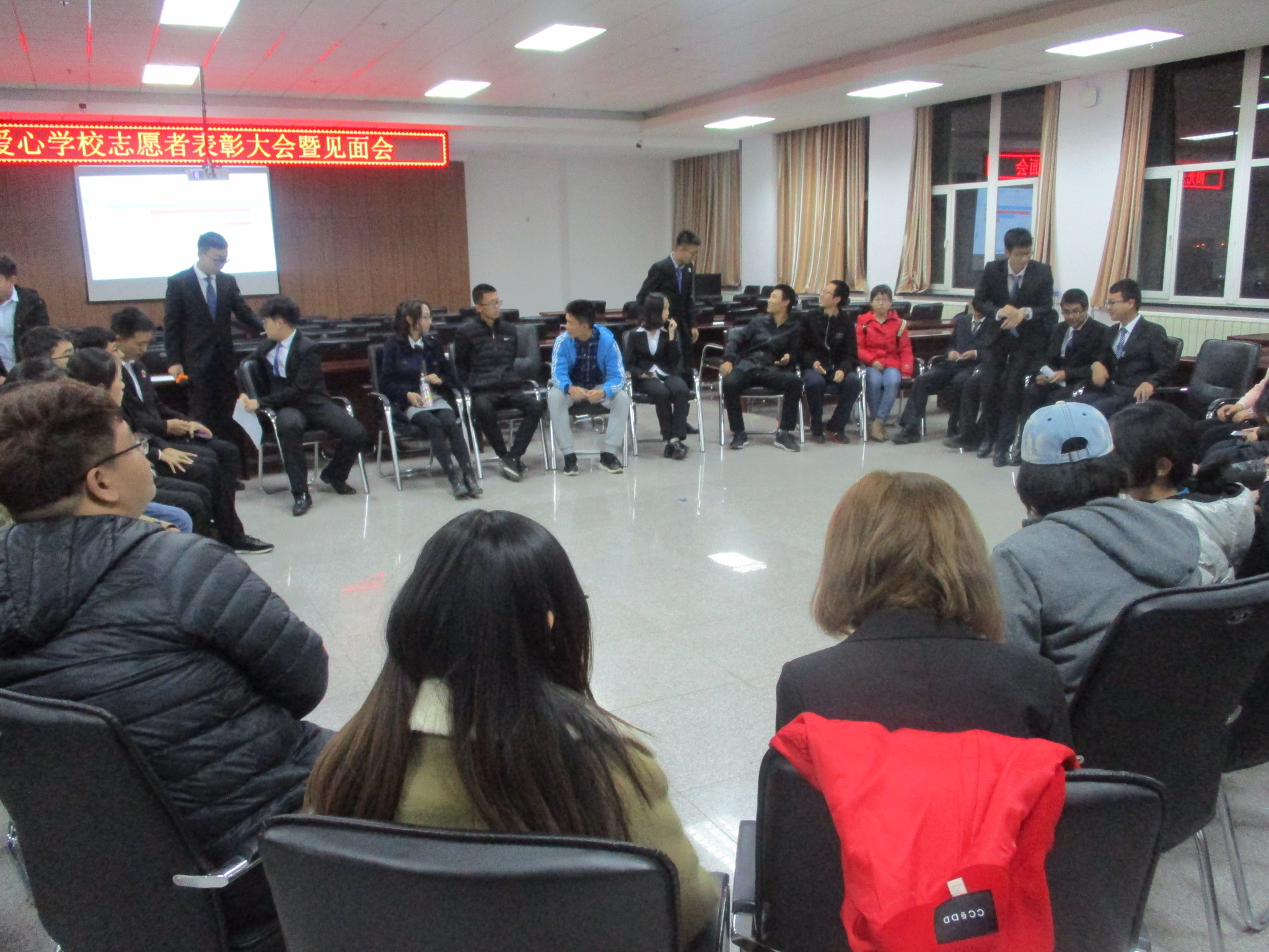 首先主持人通过《以梦为马》一诗拉开活动的序幕,紧接着社区基地、省博物馆基地、特殊教育基地、支教处基地负责人依次上台发言,和大家分享他们过去一年的活动感悟,然后由阳光爱心学校副校长及秘书长为十佳志愿者和优秀志愿者颁奖,并由优秀志愿者陈怀宁代表发言,接着志工部部长滕宏带领志愿者们宣读志愿者誓词,最后由阳光爱心学校副校长许浩源以自身经历向志愿者们予以告诫和鼓励。颁奖结束后还设有游戏环节,意在活跃气氛、让志愿者们更加熟悉。晚8点,此次表彰大会暨见面会圆满结束!