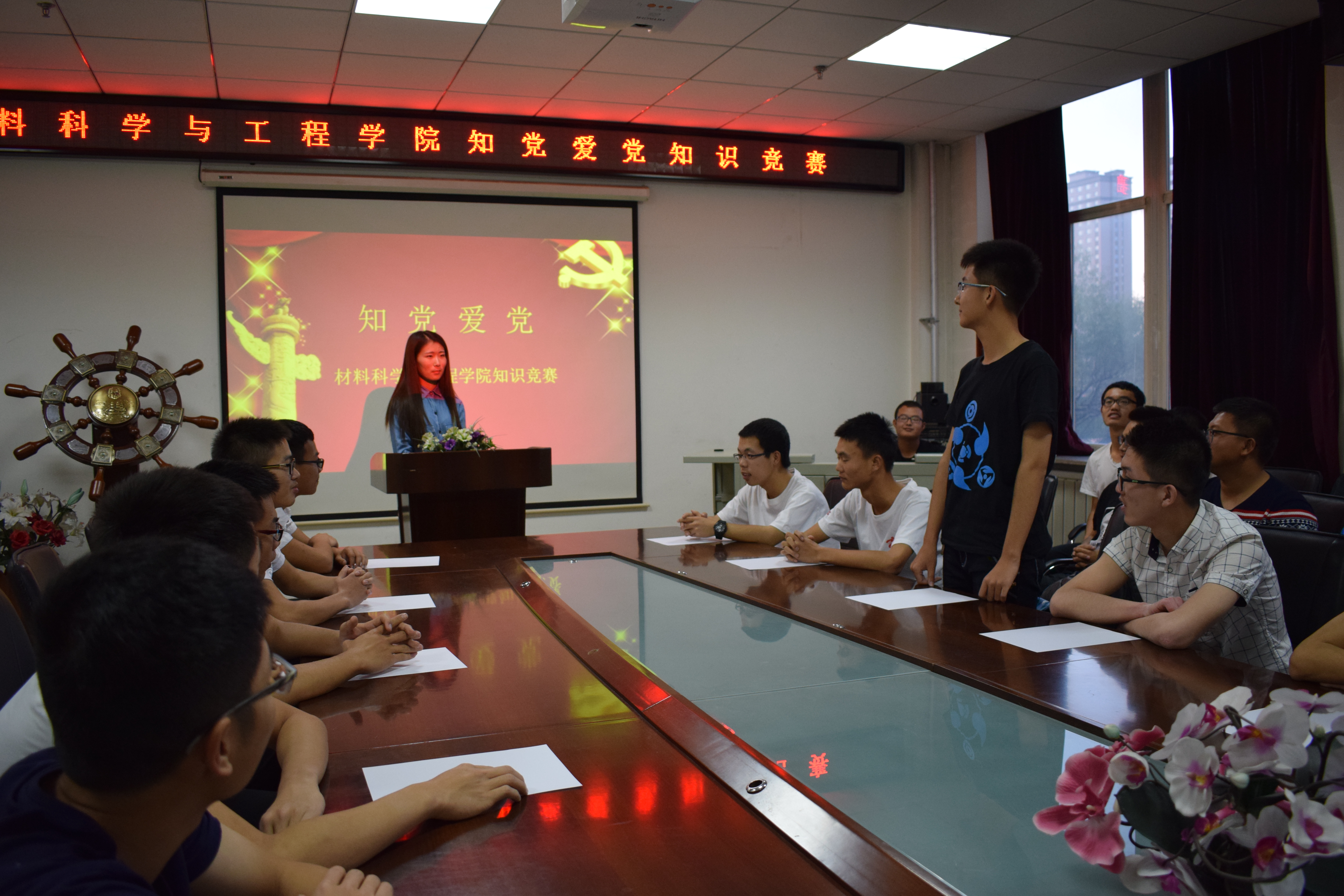 为传承革命情怀,发扬爱国精神,展现祖国风采,进一步推动我院校园文化的发展,加强学生的思想道德建设,提高学生的综合素质,培养广大学生的思维创新能力,展现当代大学生风华正茂的精神面貌,材料学院于6月3日开展“知党爱党,共圆美好材子梦”为主题的知识竞赛活动。经过三天初赛、复赛的筹备与比拼,于6月7日在逸夫机械材料馆410室举办了决赛并对优秀的同学进行了表彰。材料学院团委书记兼2013级辅导员张本龙出席此次活动。
