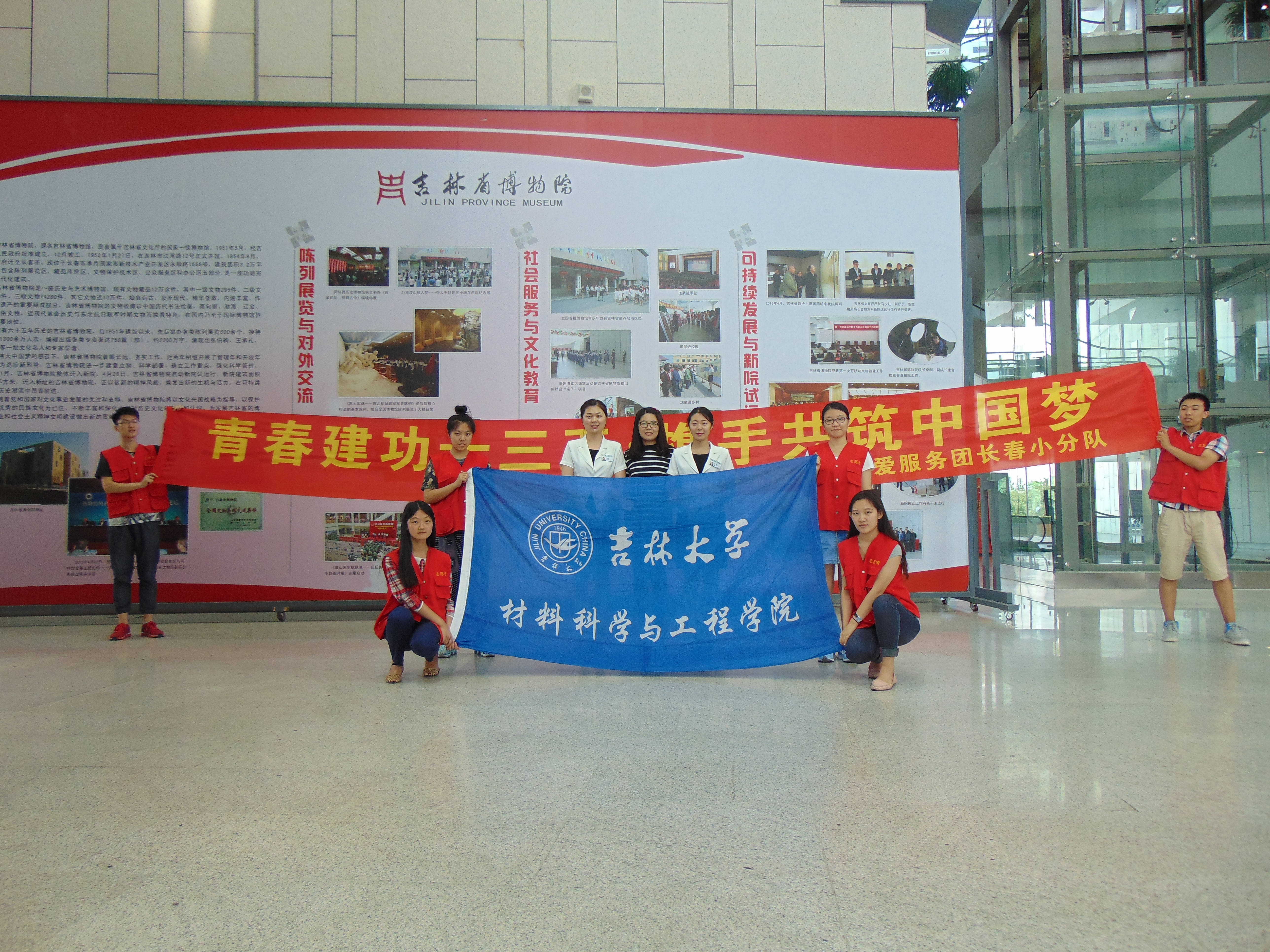 南岭校区西门集合,乘坐公交车前往吉林省博物院。到达省博门口,工作人员将服务团成员带至博物院一楼大厅,指导服务团成员换上省博志愿者服装,对其进行分配和前期培训。志愿服务活动正式开始时,志愿者们纷纷坚守各自的岗位,进行协助讲解员的讲解、博物馆秩序的维持、保护展览品及方向指引的工作,并对刚进博物馆的参观人员进行简单介绍和义务咨询服务。最后,工作人员对此次活动进行了简单总结,对志愿者们热情饱满的志愿服务精神,以及认真细致的志愿服务态度表示认可。之后,同学们和工作人员以及讲解员们在一楼大厅进行合影留念,本次志愿服务活动圆满结束。