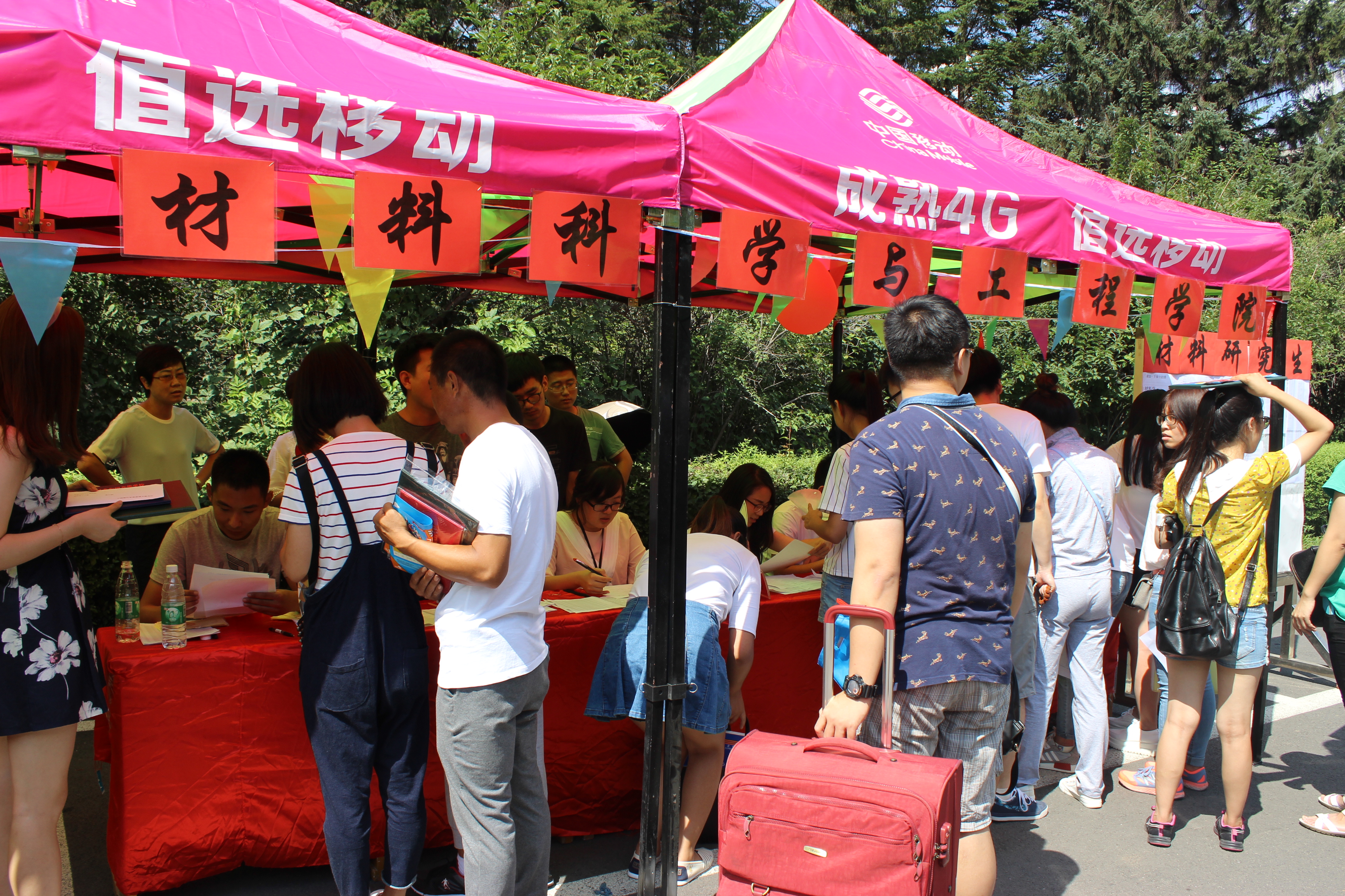 在第二教学楼前举行研究生迎新工作。来自全国各地的16级新同学陆续完成入学手续的办理。