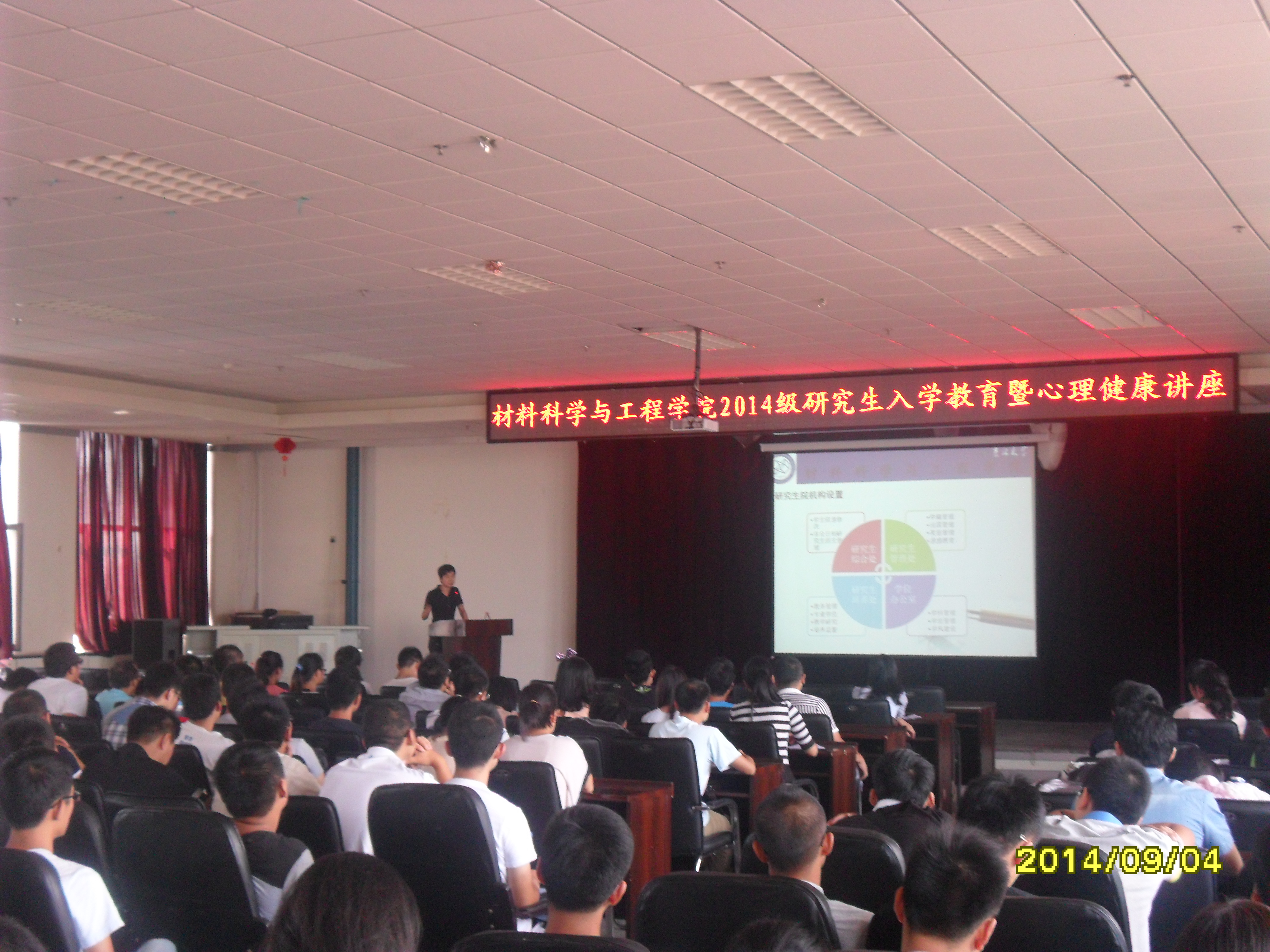 2014年9月4日上午,我院在逸夫机械材料馆举行了研究生入学教育暨心理健康专题讲座。材料学院党委副书记于雅琳老师主持了本次讲座,研究生办公室秘书刘徽老师及2014级全体硕士、博士研究生参加了本次讲座。