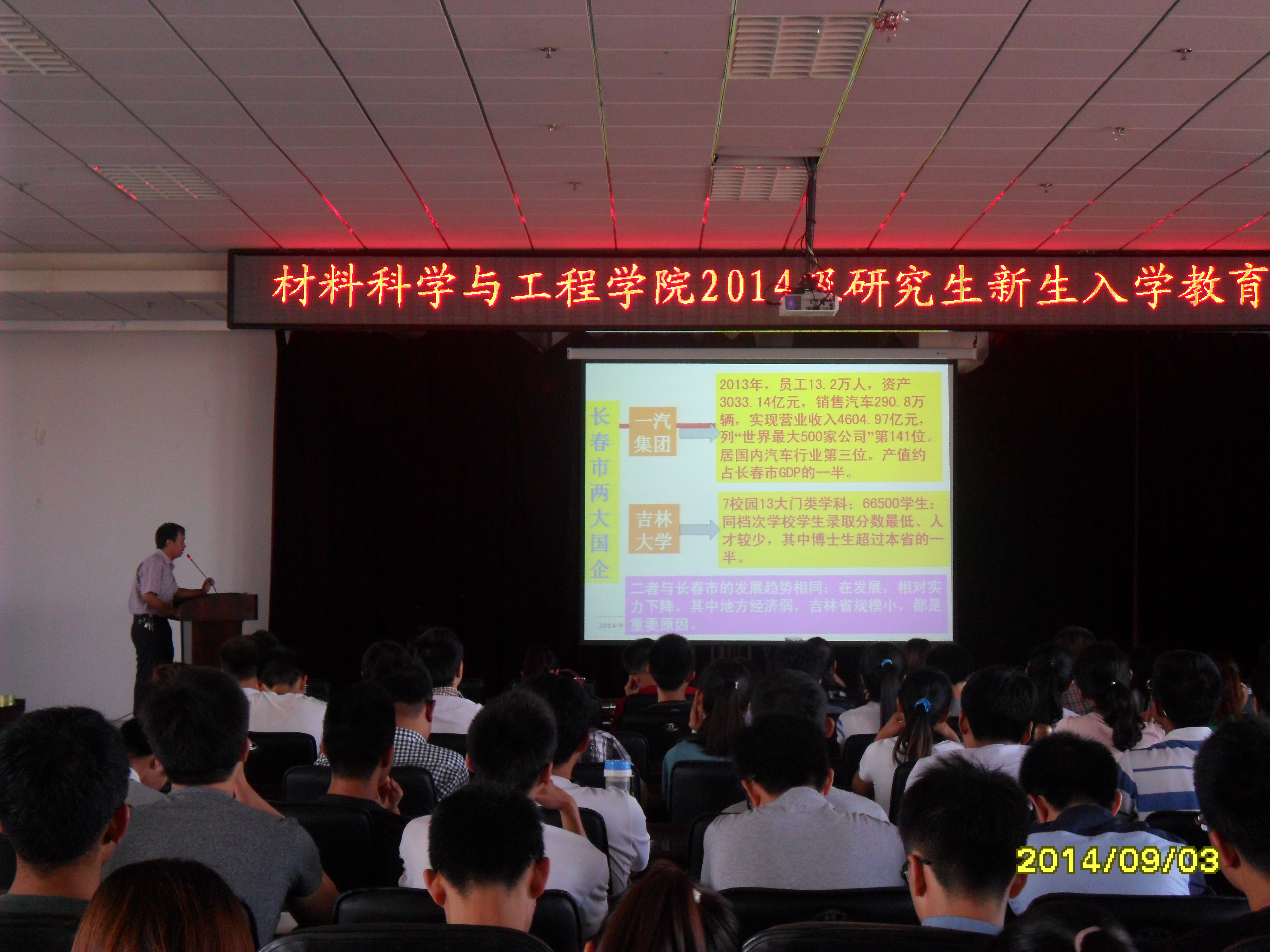 2014年9月3日上午,我院在逸夫机械材料馆报告厅举行了2014级研究生入学教育大会。副院长朱永福教授、党委副书记于雅琳老师、研究生办公室秘书刘徽老师,以及材料学院2014级全体博士、硕士研究生参加了本次会议。