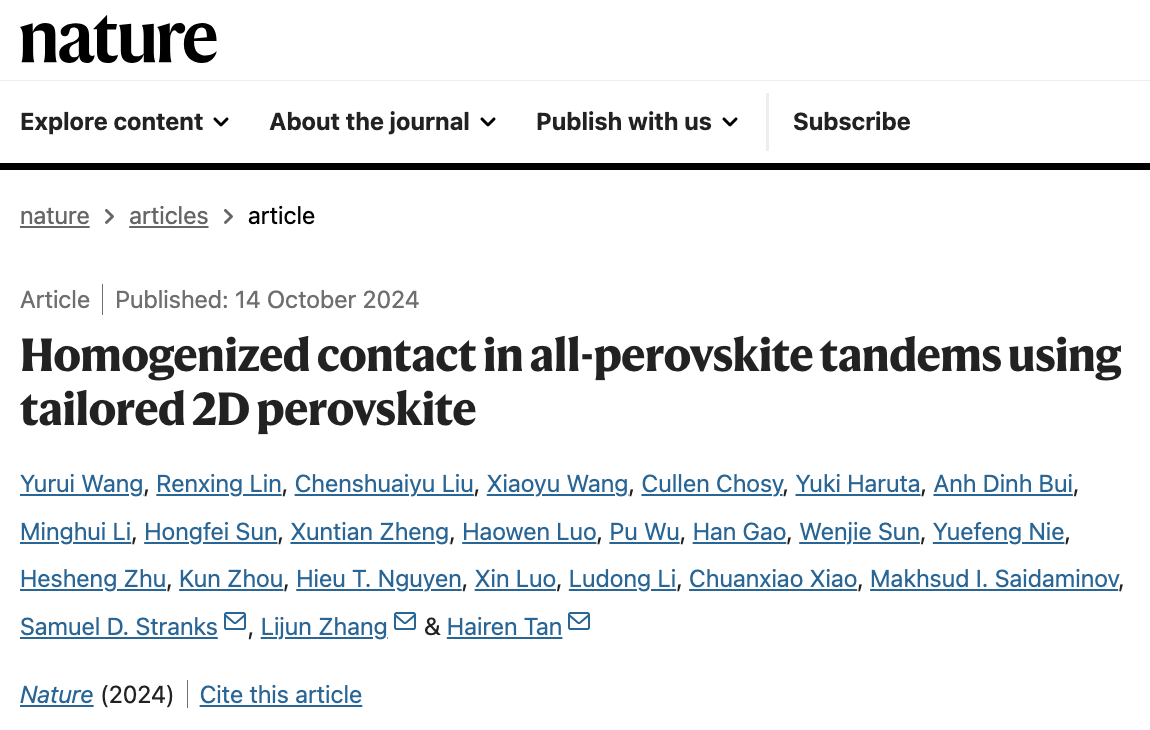 近日,日本av 张立军教授团队,与南京大学谭海仁教授、剑桥大学Samuel D. Stranks教授团队合作,实验研究与理论计算相结合,在大面积全钙钛矿叠层太阳能电池的电子传输层界面优化设计方向取得重要进展。研究围绕大尺寸太阳能电池器件的电子传输层界面优化这一关键科学问题,创新性地引入包含一组含氟胺配体有机分子的定制二维钙钛矿插层,从而改善界面接触,优化电子提取和传输过程,实现了相应尺寸下全钙钛矿叠层电池的当前世界最高效率,成果以“Homogenized contact in all-perovskite tandems using tailored 2D perovskite”为题,于2024年10月14日发表在《Nature》上。