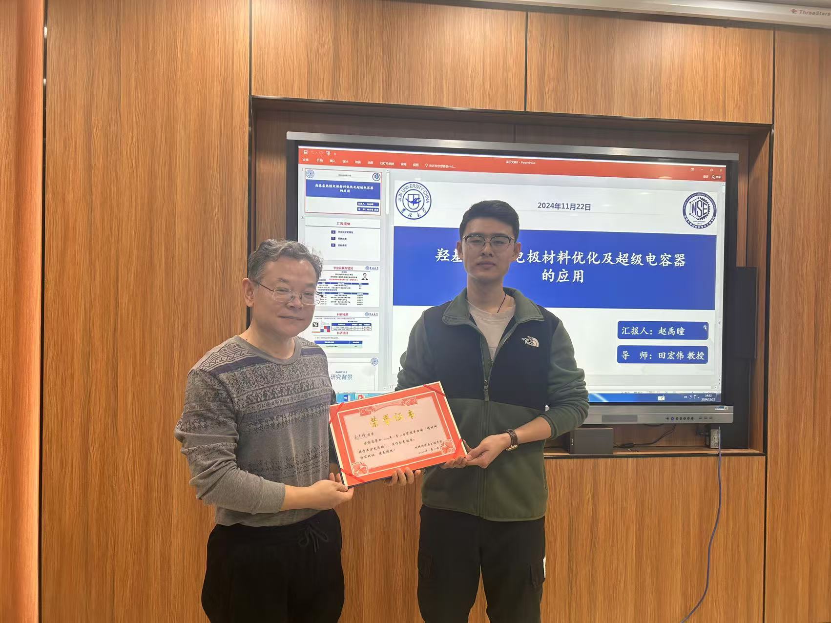 赵禹曈同学分享的主题是羟基氟化镍电极材料的设计及应用,过渡金属羟基氟化物作为一种新型的电极材料,因其具有较高的理论比容量以及优异的电化学性能而受到业内学者的广泛关注。本报告以羟基氟化镍作为电极材料,提出铁掺杂调控价态的策略:引入Fe元素优化电子结构,降低电子转移阻力并诱导高价态Ni3+δ的产生,丰富氧化还原过程,有效增强储能。由该材料组装的柔性非对称型超级电容器,具有112.6 Wh kg-1的高能量密度。此外,Fe、Cr双元素掺杂作为电子供体提高电化学性能,复合石墨烯成功解决稳定性差的问题,可以达到双优化的目的。