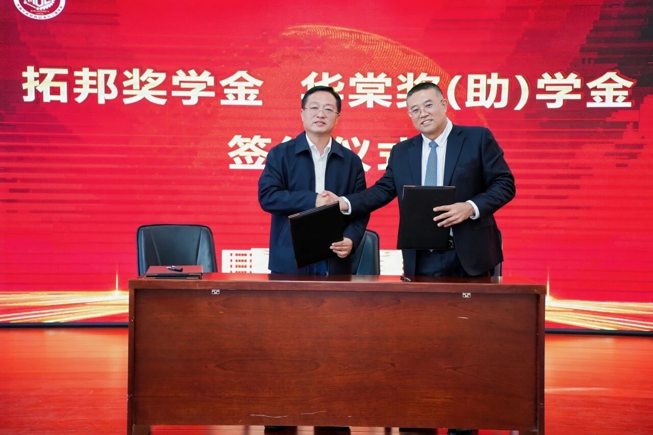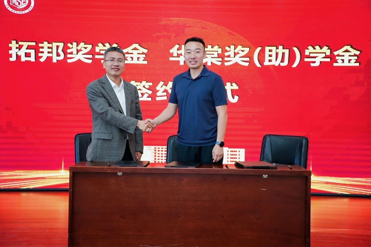 校友和基金会工作办公室主任康永刚与绍兴市铂兴科技有限公司、1997级校友王秀平签署华棠奖助学金协议。张立军与江苏拓邦华创科技有限公司董事长、2001级校友赵慧宇签署拓邦奖学金协议。