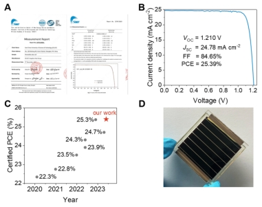基于这种新型有机空穴传输材料制备的反式结构钙钛矿太阳电池在第三方机构的认证效率达到25.39%(图3A),为目前该类太阳电池的最高认证效率(图3B)。此外,该新型有机空穴传输材料良好的浸润性十分有利于制备大面积的器件,1 cm2的器件和10 cm2的模组(图3C)分别实现了23.4%和22.0%的效率。