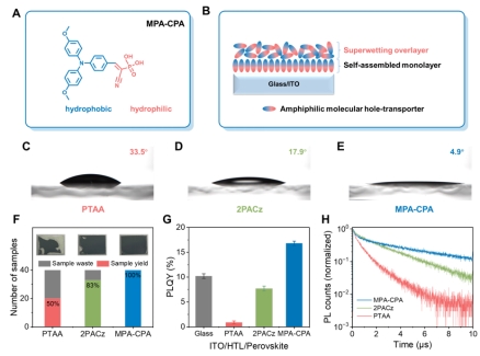 为解决这个挑战问题,合作团队实验研究和理论计算相结合,提出在空穴传输分子上创新引入氰基膦酸单元,发展双亲性小分子空穴传输材料((2-(4-(bis(4-methoxyphenyl)amino)phenyl)-1-cyanovinyl)phosphonic acid,即MPA-CPA,如图1A),通过动态自组装构筑有序、超薄、表面超浸润薄膜(图1B-E),从而解决了器件应用中载流子输运和界面缺陷控制两大难题(图1F-H)。