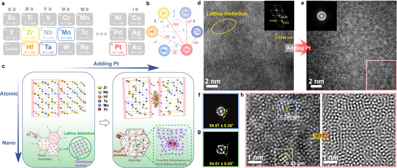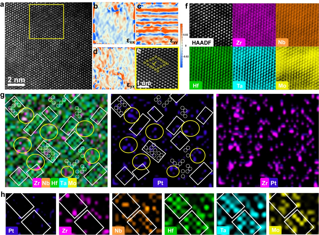 图2 . Zr16Nb14Hf22Ta23Mo25和Zr15Nb14Hf22Ta22Mo24Pt3 HEA中的像差校正TEM成像和元素分布图。a-d,Zr16Nb14Hf22Ta23Mo25 HEA的原子分辨率HAADF图像和相应的水平正应变(εxx)、垂直正应变(εyy)和剪切应变(εyx)的原子应变图,表明了严重的晶格畸变。e, 反傅里叶(IFFT)图像,对应于(a)中黄色正方形的面积,表明刃型位错的Burgers回路(标记为“⊥”,所涉及的原子用黄色圆圈标记)。f, Zr16Nb14Hf22Ta23Mo25 HEA的原子级HAADF图像,以及Zr、Nb、Hf、Ta和Mo的单个元素的EDS图,显示了每个组成元素的相对均匀分布。g, 对于Zr15Nb14Hf22Ta22Mo24Pt3 HEA,五种组成元素(Zr、Nb、Hf、Ta、Mo)叠加EDS图、Pt元素的单独EDS图以及相同位置的Zr和Pt元素叠加EDS图。白色正方形标记的有序原子排列总是位于无Pt区域,而黄色圆圈标记的无序基团与Pt原子的存在密切相关;白色小圆圈也揭示了有序簇的存在。Pt和Zr原子倾向于出现在相同的位置,表明形成了富含Pt-Zr的无序基团。h, Zr、Nb、Hf、Ta、Mo和Pt的单个元素的更大分辨率EDS图。白色方块表示Pt-Zr耗尽的有序区域。