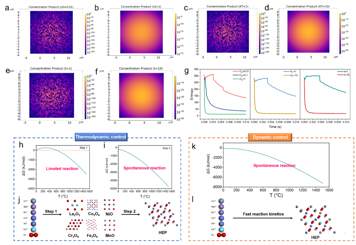 图2. (a-b) 当C0 = 0.01, 1 mol m-3时的离子浓度积分分布。(c-d) 当KT = 1, 10 K s-1时的离子浓度积分分布。(e-f) 当t = 1, 10 s时的离子浓度积分分布。(g) 在不同的C0, KT和t值下的熵的时间序列。(h) 第一步反应和(i) 第二步反应在不同温度下的反应。(j) 热力学控制的反应路径。(k) 在不同温度下的反应的ΔG值,以及(l) 动力学控制的反应路径