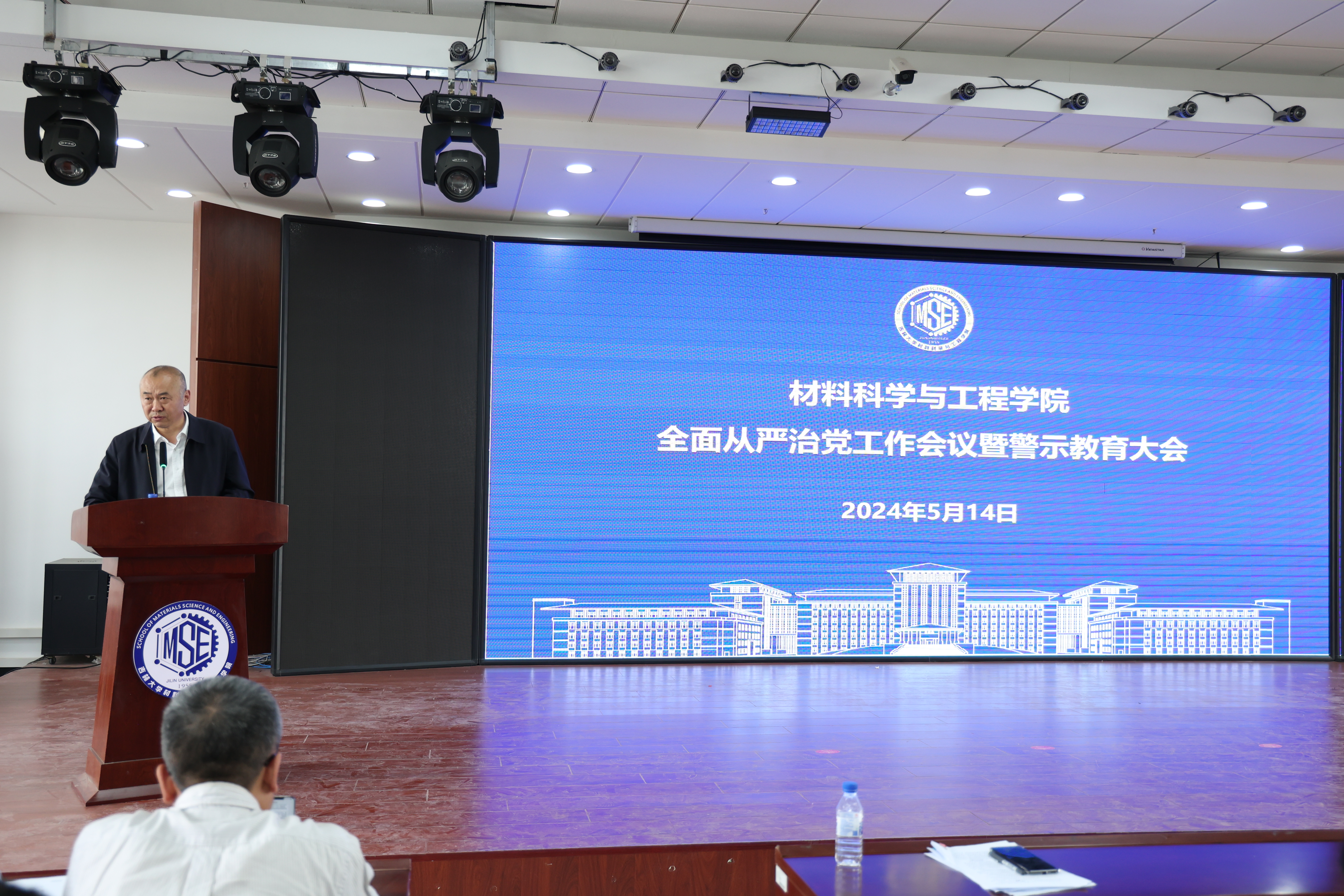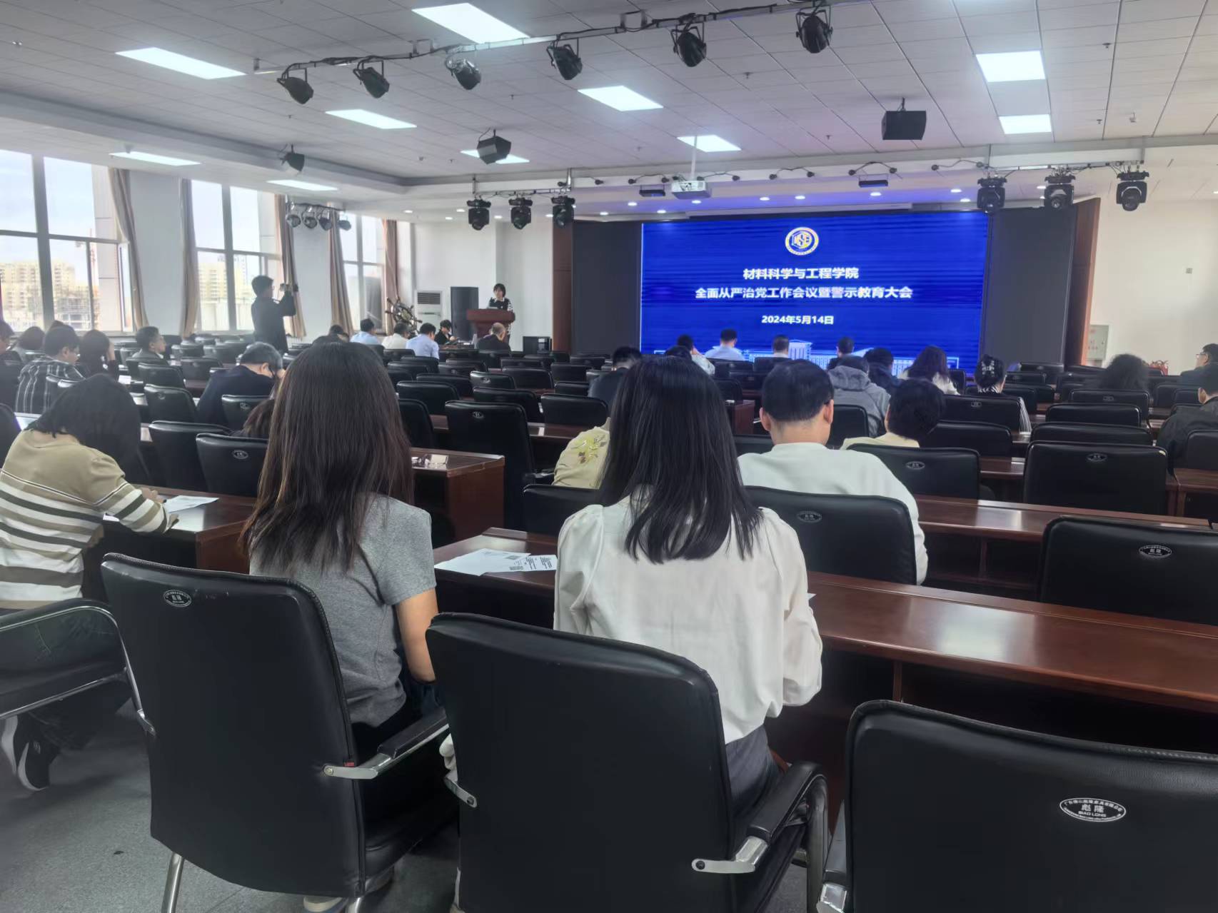 在材料馆八楼报告厅召开2024年全面从严治党工作会议暨警示教育大会,全面贯彻二十届中央纪委三次全会精神,深入学习贯彻习近平总书记关于党的自我革命重要思想,学院教职工代表参加会议。会议由党委书记刘远主持。