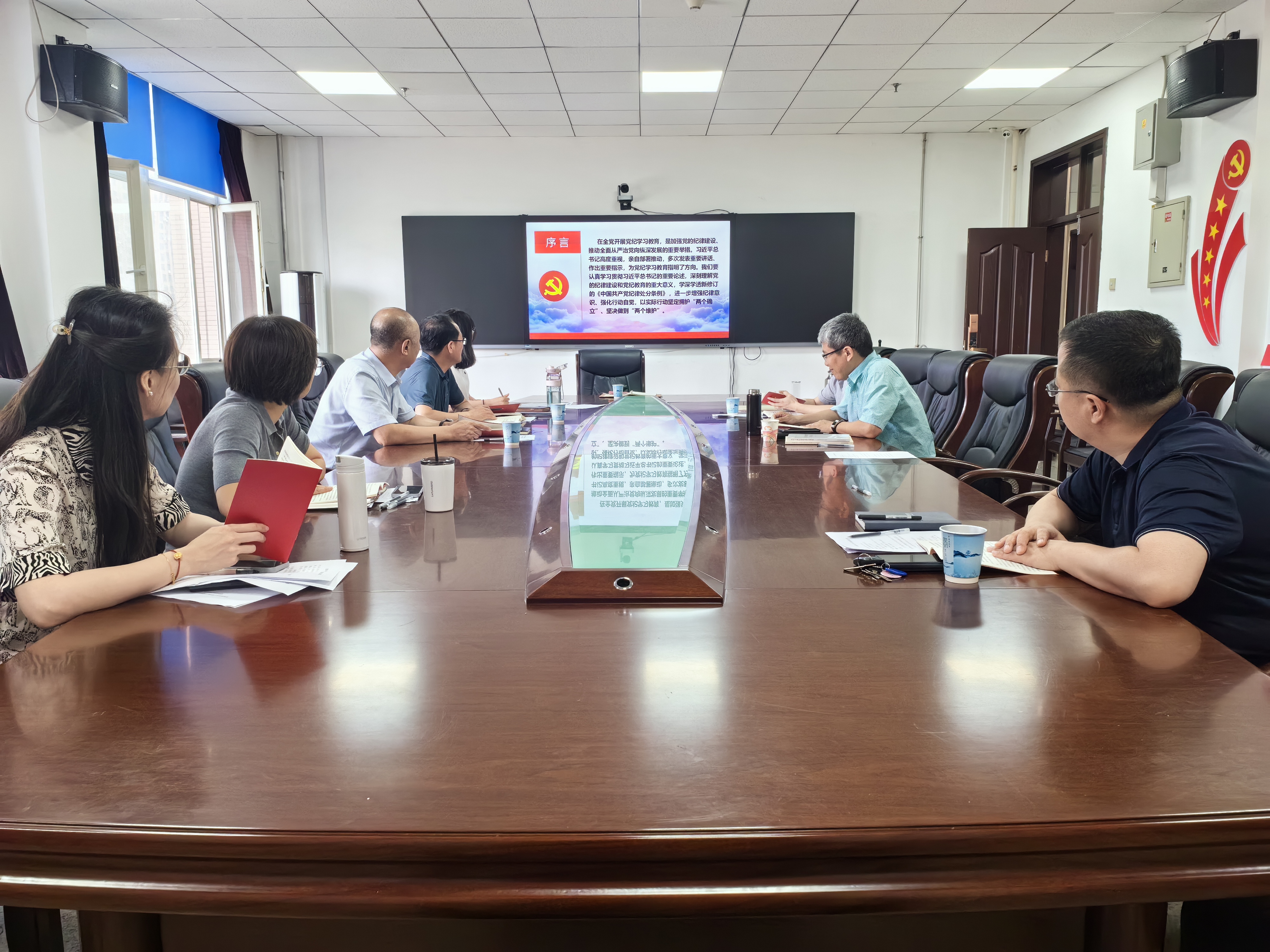 与会人员集体观看中国浦东干部学院原副院长、华东师范大学特聘教授刘靖北作的题为《把党的纪律建设摆在更加突出的位置 为强国建设民族复兴提供坚强纪律保障》辅导报告;观看警示教育片《永远吹冲锋号》第一集《第二个答案》。