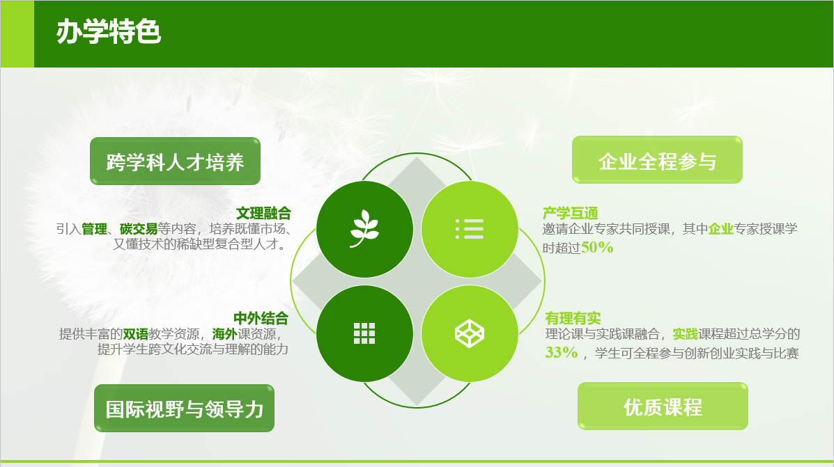 “先进储能工程”微专业,聚焦大规模绿色能源存储与利用领域,开设文理融合的跨学科综合性专业课程,课程体系与内容涵盖:能源材料、高耗能工业制品、工业设计、能源管理、储能工程、数字能源、储能融资投资等特色内容。积极借鉴国外高水平大学的相关海外课程,开拓本科生的国际视野、提升培养质量。同时,强调理论与实践的结合,开设产业引领型特色实践模块,实现课程内容的学以致用,夯实能力培养环节。