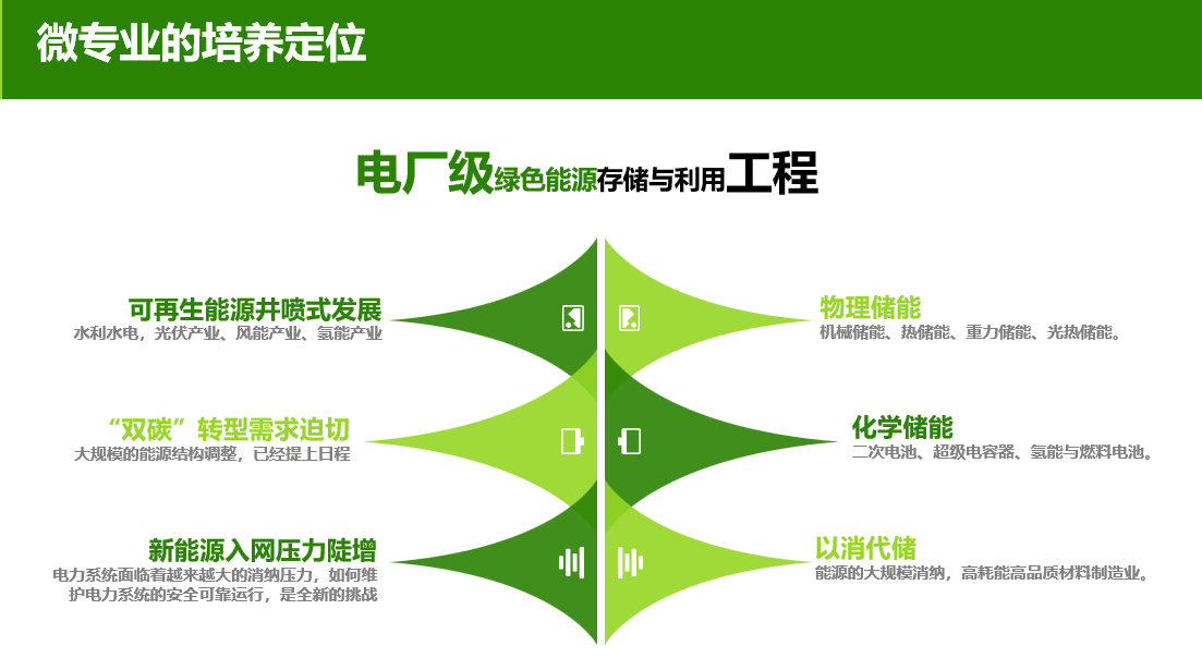 “先进储能工程”微专业旨在培养具有能源、电气、化学、材料、物理、控制等交叉学科的基础理论,掌握电能、热能、机械能、化学能等能量存储和转化相关的科学知识,能在储能、化工、新能源、新材料、分布式能源和节能环保等国家战略性新兴产业领域从事科学研究、工程设计、技术研发和生产技术管理等方面工作的,厚基础、宽专业、强能力、高素质,具有较强实践能力、知识获取能力、社会交往能力、组织管理能力及国际视野和创新精神的优秀人才和创新人才。