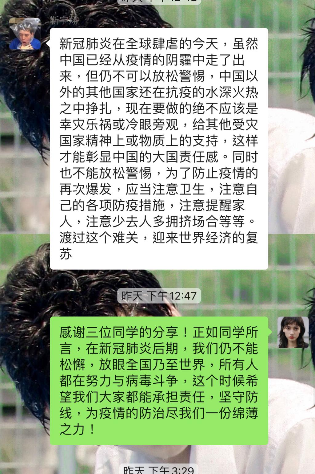 为了贯彻习近平总书记关于疫情防控工作的系列重要讲话和指示批示精神,日本av 于5月1日至5月7日于线上召开了主题班会,2016至2019级同学都参加了本次活动。