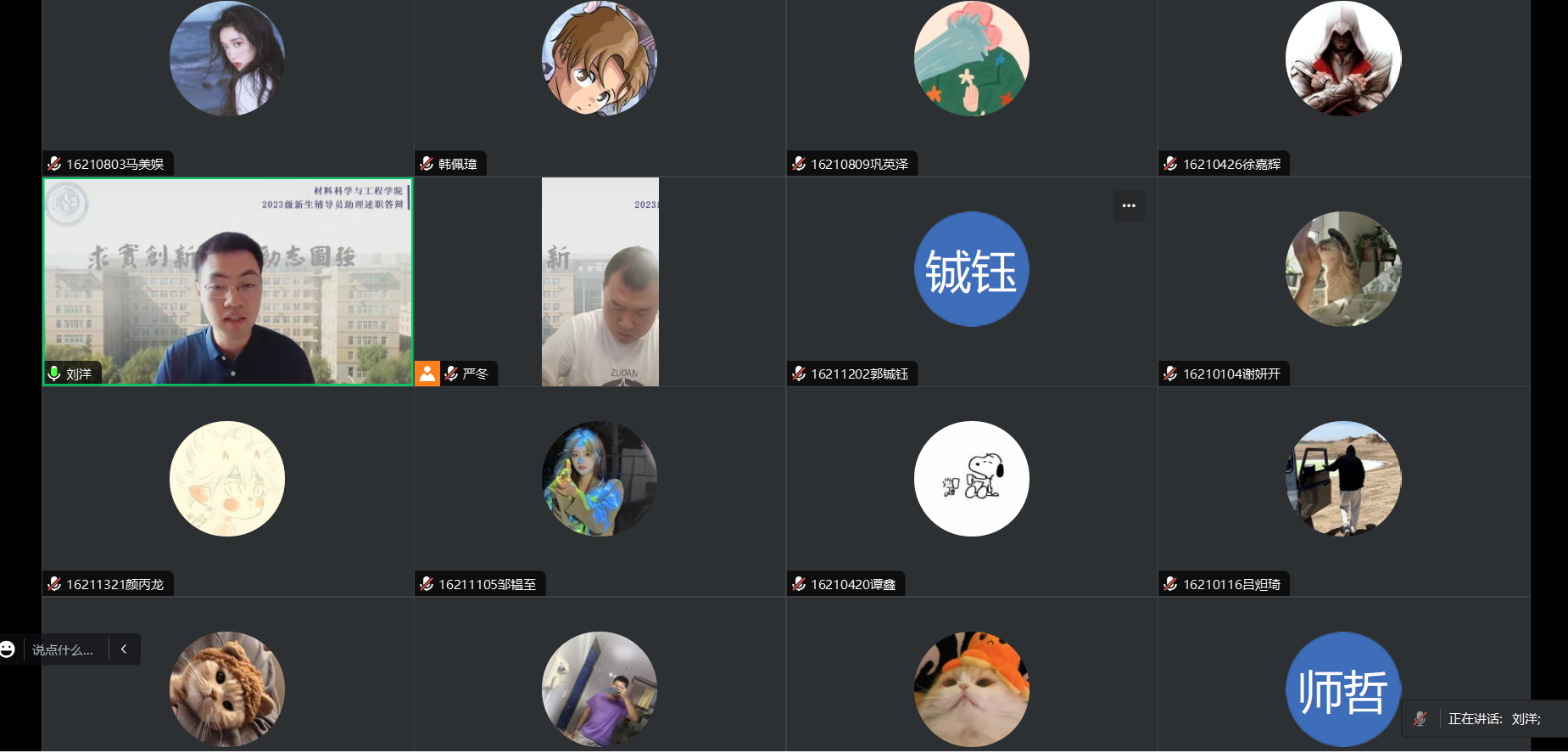8月13日,学院召开了辅导员助理、班主任助理工作培训会议。2021级、2023级材料类专业辅导员严冬老师、2023级材料物理专业辅导员刘洋老师了参加本次线上工作培训。