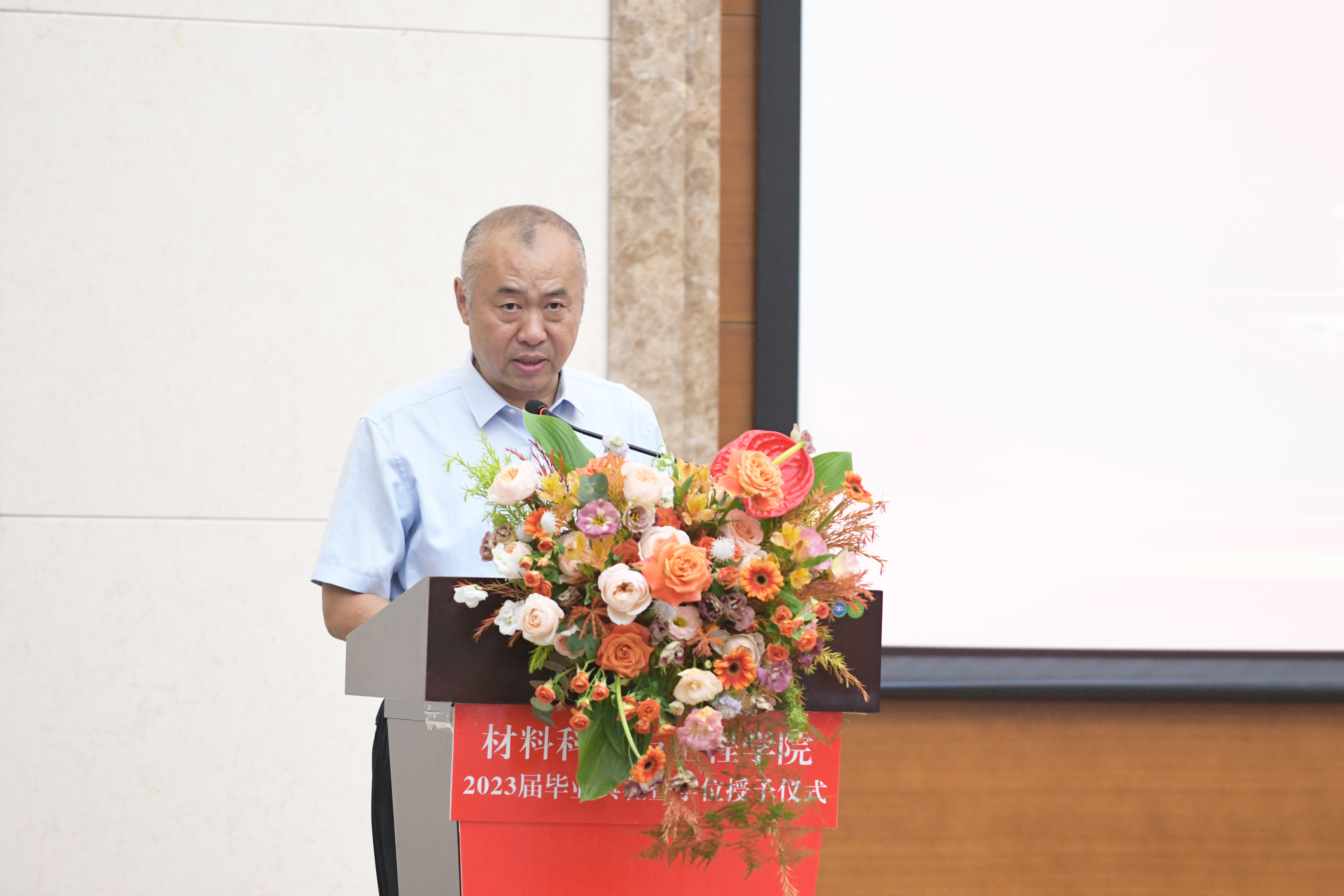 院长张立军老师讲话,向即将踏上人生新征程的毕业生致以最诚挚的祝福,向无私奉献、为毕业生成长倾注大量心血的老师们致以亲切的问候和崇高的敬意!张立军院长向毕业生送上了专属于材料人的嘱托。最后向同学们推荐了几本书,希望同学们高效率喧嚣的世界里保持一份“惟精惟一”的内心宁静。