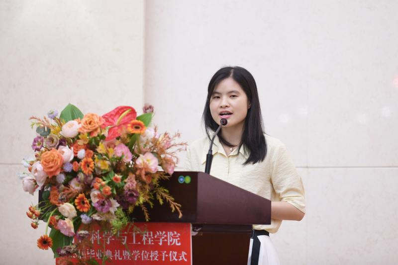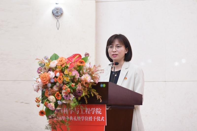 教师代表材料加工工程系查敏老师发言,表达了学院老师对各位毕业生的依依不舍,并祝愿2023届毕业生人生皆坦途,所遇皆良人,在以后的学习和工作中取得佳绩。