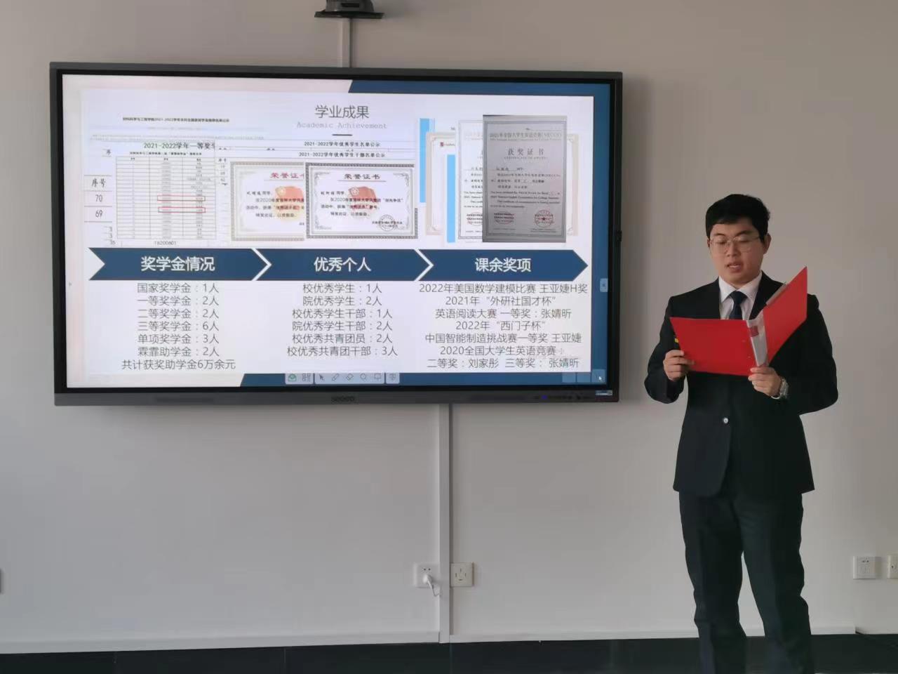 2021—2022年度院十佳大学生、材料之星、院十佳班级评审答辩。本次答辩会,由党委副书记兼副院长华蕊、材料科学系主任王海涛、材料加工系张新戈教授、金属材料工程系王智力教授、高分子材料与工程系窦艳丽教授、无机非金属材料工程系张培萍老师、学生工作办公室主任兼2021级辅导员严冬、2020级兼2022级辅导员王晗、材料物理专业辅导员张晗禹组成评审团。