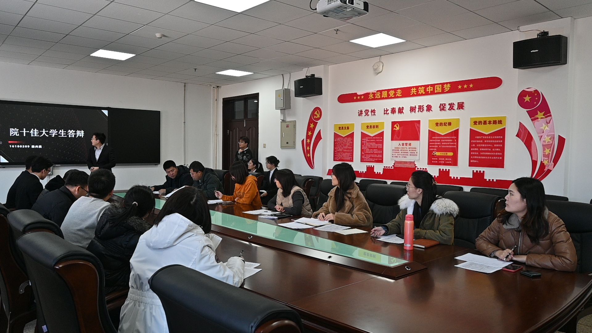 2021年度院十佳大学生、材料之星、优秀学生党员暨十佳班级答辩大会”。 材料学院张晓宇老师、王智力老师、窦艳丽老师、高钱老师、徐晓峰老师、党委副书记兼副院长华蕊老师及学生办公室全体老师作为评审出席了本次答辩会。