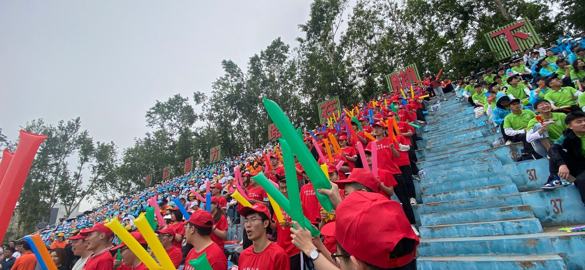 运动会开幕。我院观众身着红衣,头戴红帽整齐入座。手持彩色应援棒,跟随组织人员气势磅礴的击鼓声,整齐的做着训练动作,为我院的运动员呐喊助威。“凌云赛场,斗志昂扬,唯我材料,创造辉煌。”短短16字,体现了材料学子的拼搏精神和信心,观众们挥舞充气棒大声喊出学院口号,威震八方。上午比赛项目结束,组织人员为观众们准备了盒饭,全员进行短暂午休。