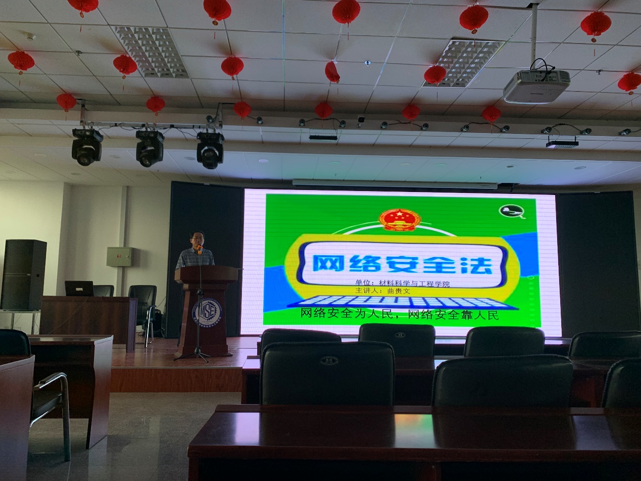 2020年9月22日10:00时,在材料管八楼会议室,学院党委副书记曲贵文以“网络安全为人民,网络安全靠人民”为题,为2019级硕士研究生党支部及2019级博士研究生党支部开展了网络安全教育。
