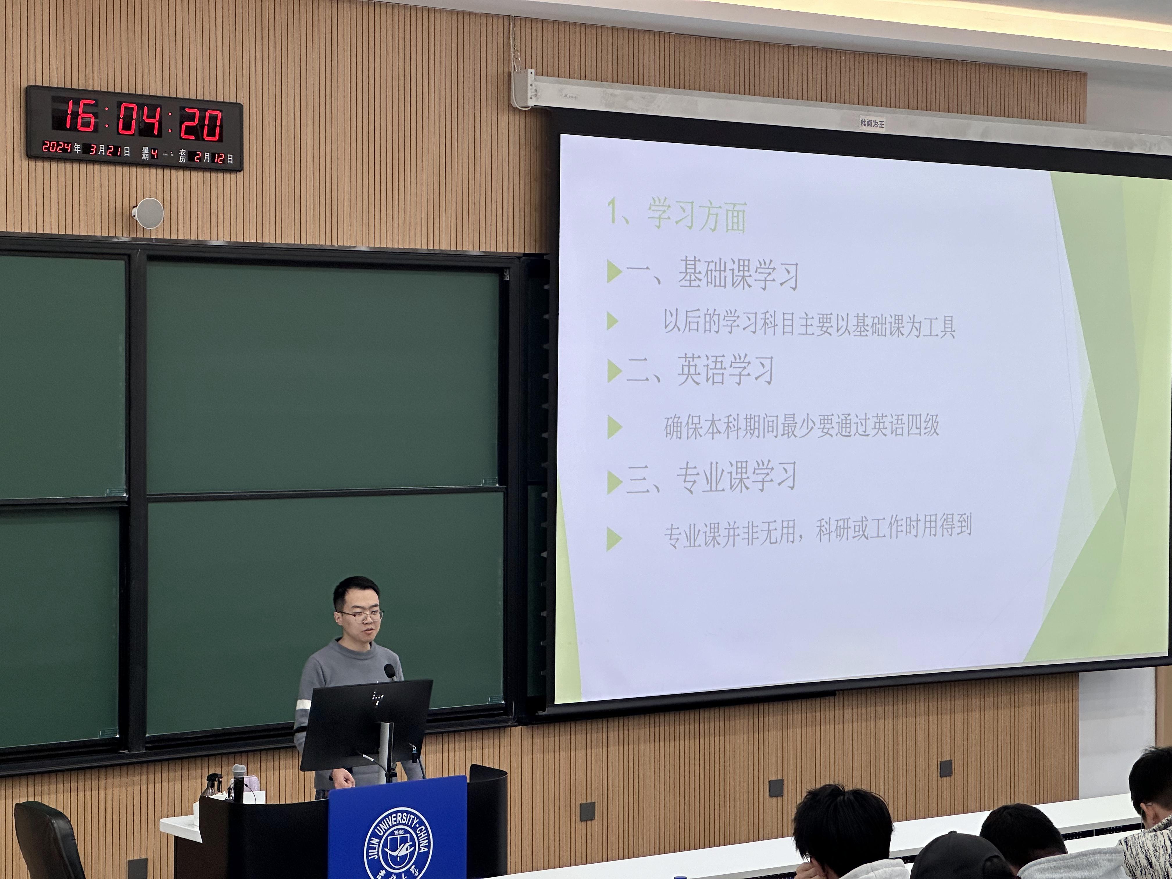 三位学长分别从本科生活与研究生生活区别,就业方向及要求和本科生与研究生就业区别三个方面进行分享。学长结合自身面试经历,讲述一汽奥迪中英双语两次面试的过程,着重强调了英语的重要性,并鼓励学弟学妹们积极备考四六级,将英语学习纳入日常计划。另两位学长多方面强调了专业课学习的重要意义。并结合当下新能源趋势分析了就业形势,最后鼓励学弟学妹们把握当下,跟紧每一步的学习,面对机会要勇于把握。