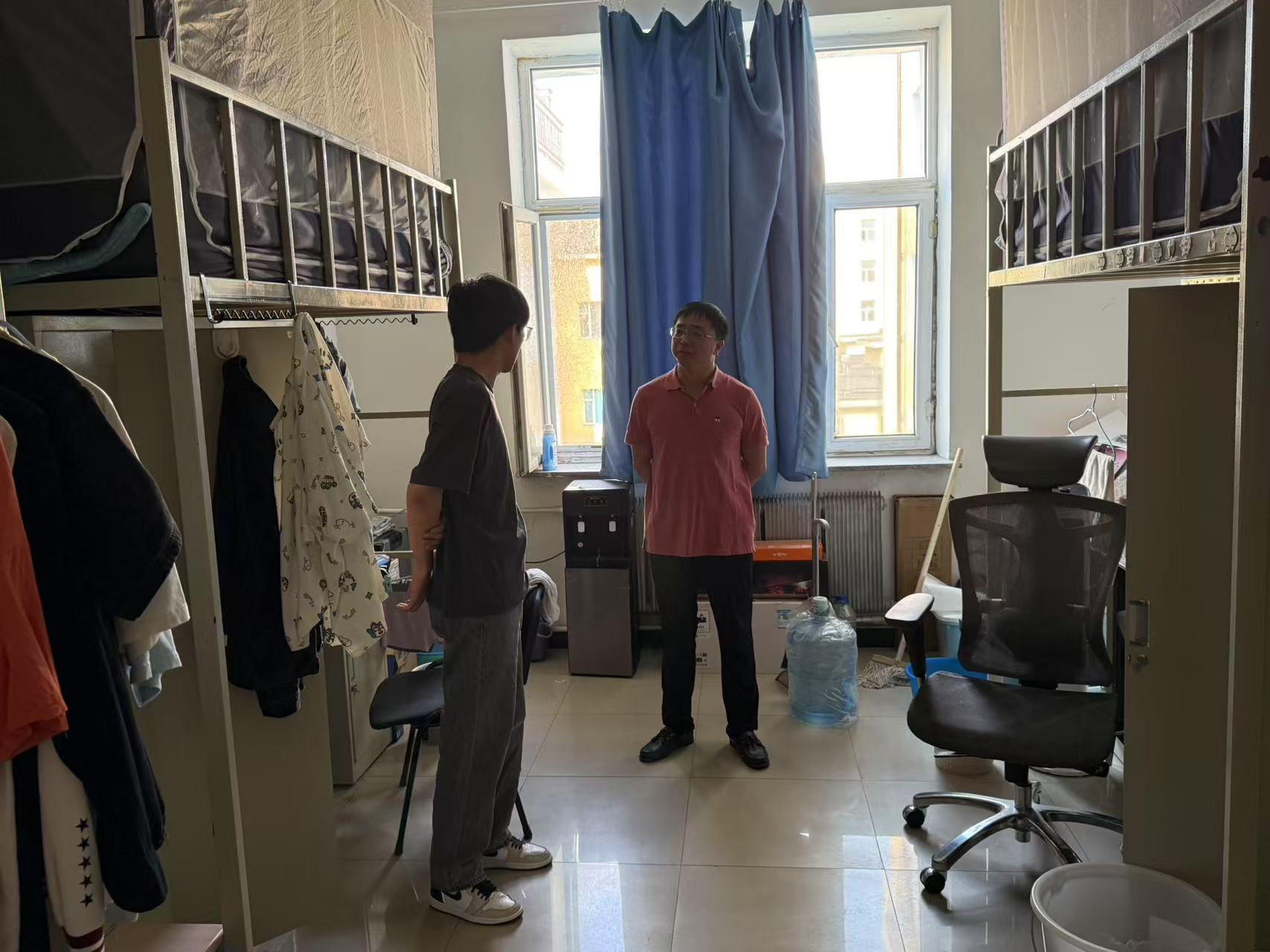 6月16日,学院党委副书记邵俊涛老师与研究生辅导员赵熙来老师一同走访了研究生工作室及南岭校区六公寓,实地了解同学们的科研进展、日常学习状态和工作环境,并检查了寝室环境卫生与违章电器使用情况。在走访检查过程中,邵俊涛老师希望同学们合理安排时间,保持良好生活习惯,坚定科研信心,以更稳定的状态投入科研工作和日常学习中。同时,就学术发展、职业规划等方面与同学们分享了自己的经验和建议,希望大家保持积极的心态,稳步推进各项科研工作。